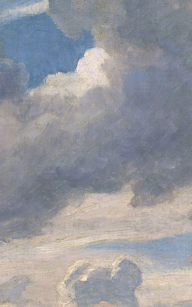 Painting with a blue sky and white and gray clouds in a study by this artist and painter.