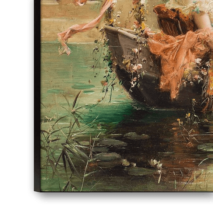 This angel is rowing in a rowing boat with a girl in it. In this romantic image we see this portrait in a landscape with a lot of water.