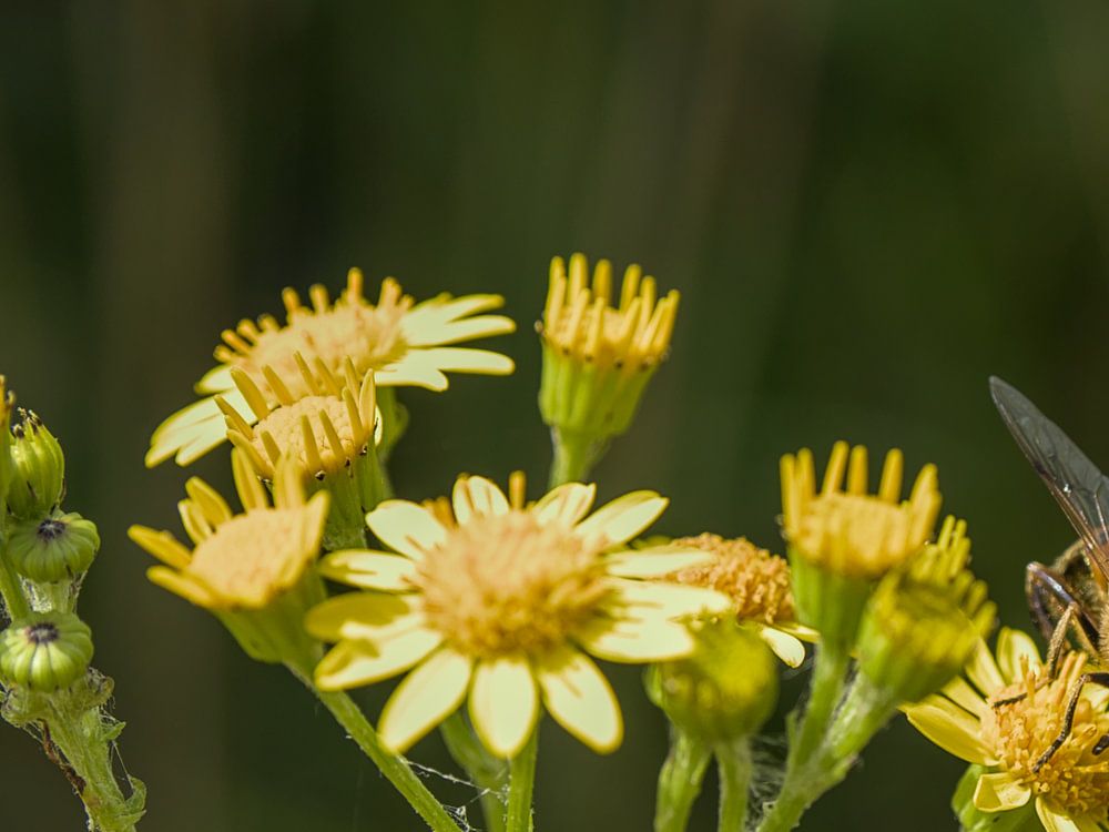 Happy bee on a yellow flower. At first glance the bee does not stand out because of the camouflaging colours of the bee on these yellow flowers.