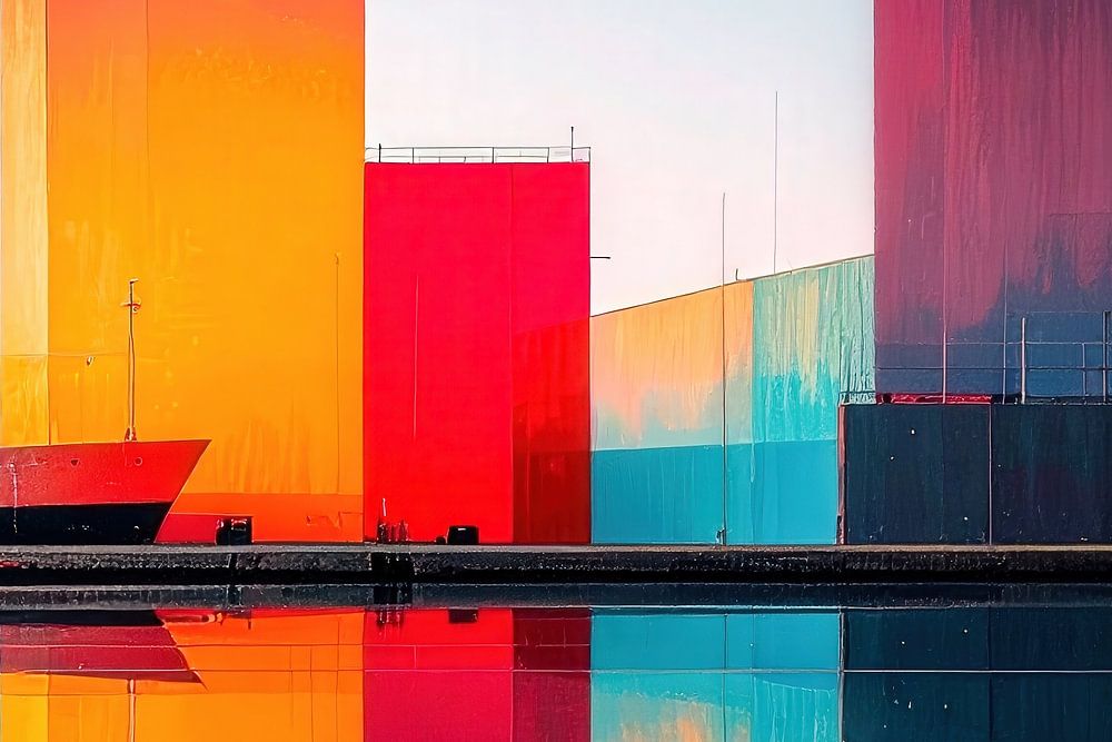 Abstractly depicted harbour facilities with lively geometric structures and strong colours are reflected in a calm body of water and create a symmetrical effect. The combination of red, orange, blue and pink tones creates a dynamic yet harmonious atmosphere......Digital art image, design and composing by me, visualisation with AI