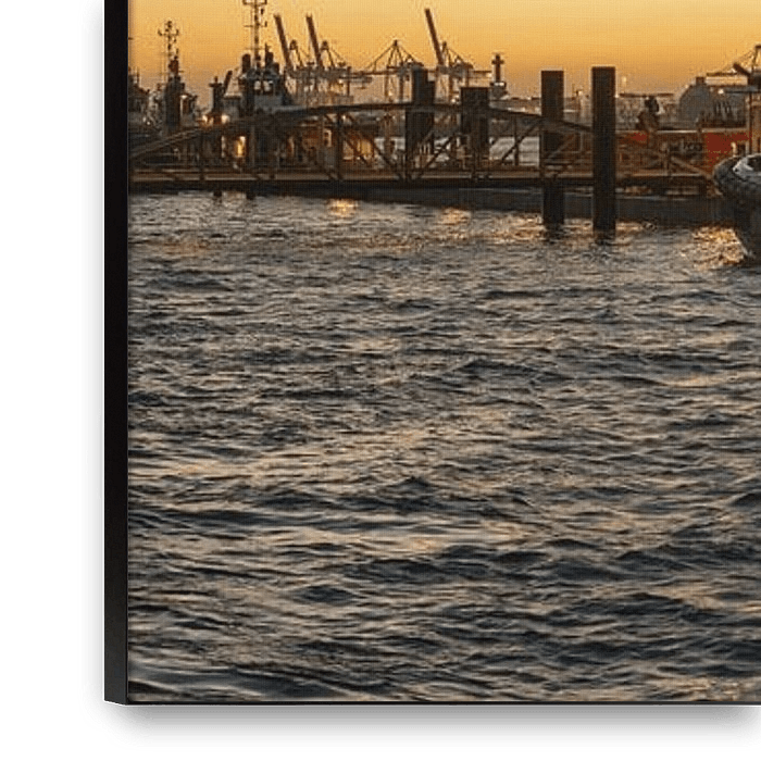 Buy the photo Harbour landscape in Hamburg at sunset with ships and cranes by Jonas Weinitschke on canvas, ArtFrame, poster and wallpaper, printed on demand in high quality.