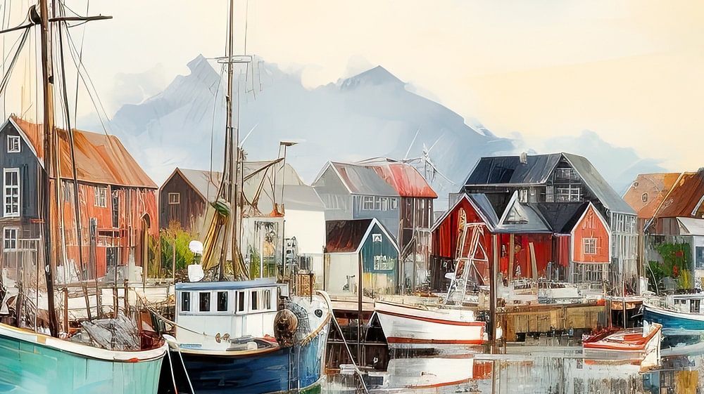 A harbour with fishing boats lies on a quiet waterfront. The gables of wooden houses reflect in the water. Mountains rise in the background, partly hidden behind a light mist. Birds hover above roofs and masts. Jetties and wooden walkways connect the quays. The composition captures a moment in a Scandinavian coastal town, where water meets architecture.