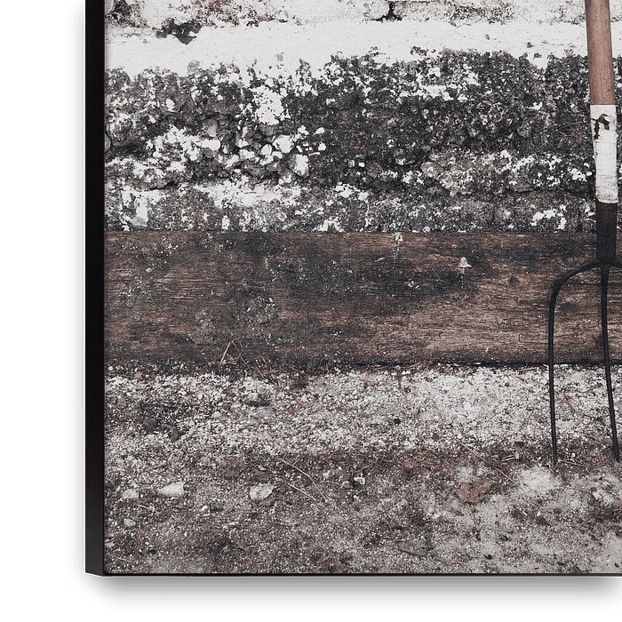 In my neighbor's farm yard, a hay-fork with a wooden handle is leaning against against a white-washed barn wall with a wooden beam as part of the wall's foundation.