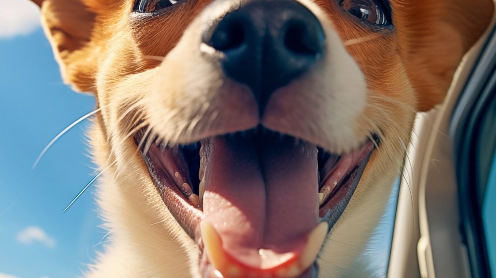 About "Head of a happy lap dog looking out of the car window."