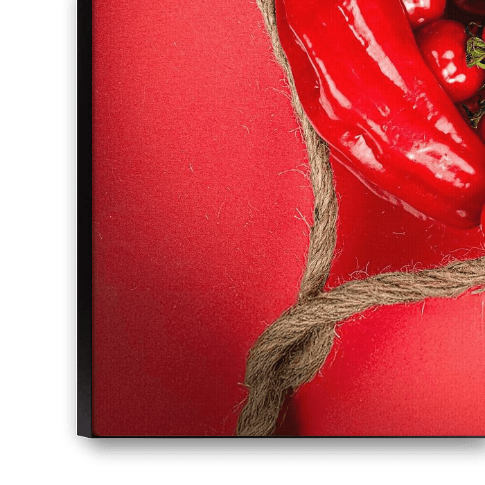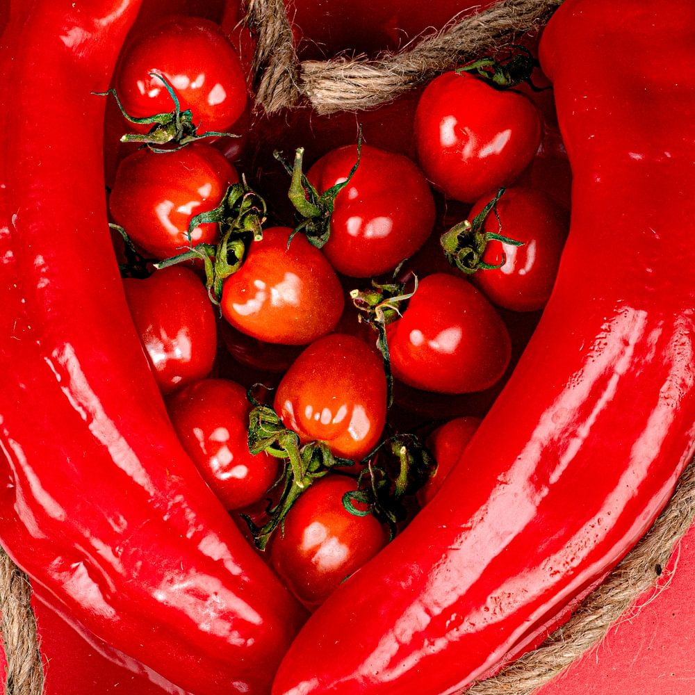 Two red Paprika's together form a heart, filled with tomatoes. The red hues splash off the canvas, symbolising passion, warmth and energy. An image that shows the power of simplicity; raw, honest and full of feeling.