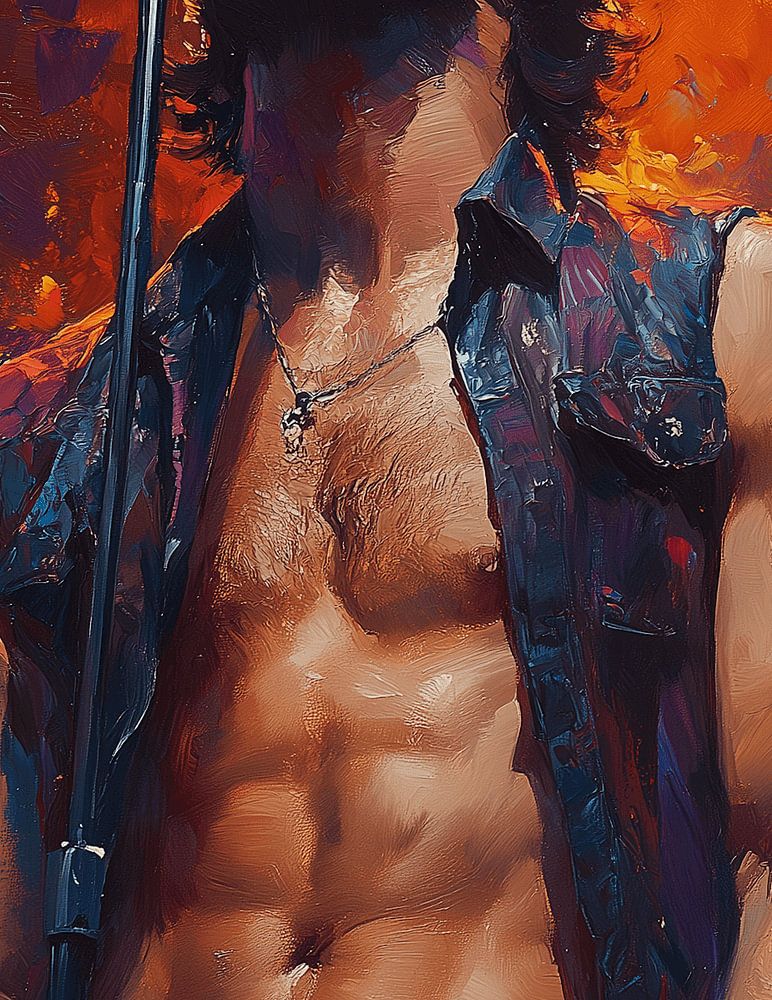 This painting captures the essence of a powerful and emotional rock performance in an explosion of colour and expression. At the centre of the image is a charismatic male rock star, giving himself completely on stage. His posture radiates pure passion: head tilted back slightly, eyes closed in surrender to the music, as if he is feeling and experiencing every word of his song. His chest is bared, emphasised by the open, unfinished denim blouse, while the warm lighting accentuates his muscular torso, making him the centre of strength and vulnerability.