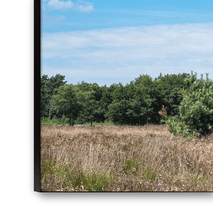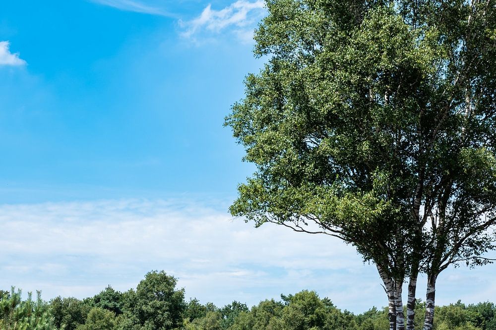 Heather and trees against blue sky at the Veluwe national park, The Netherlands