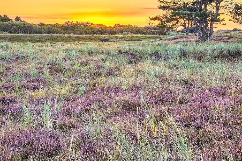 An early morning sunrise with flowering dune heather in the Grafelijkheidsduinen nature reserve in the municipality of Den Helder.