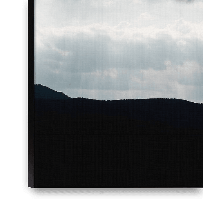 This impressive shot shows the power and splendour of nature. Powerful sun rays break through the thick clouds and illuminate the rolling mountain landscape in the distance. The gentle transitions of light and shadow create an almost spiritual atmosphere and emphasise the grandeur of the moment. This work evokes feelings of peace and…