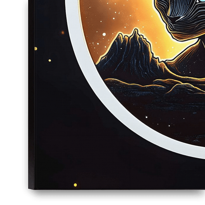 This mesmerising work of art depicts a lithe, otherworldly feline figure whose silhouette is bathed in a radiant, golden glow reminiscent of cosmic energy. With its piercing, luminous eyes, the celestial cat appears like a mystical guardian of a surreal astral landscape.