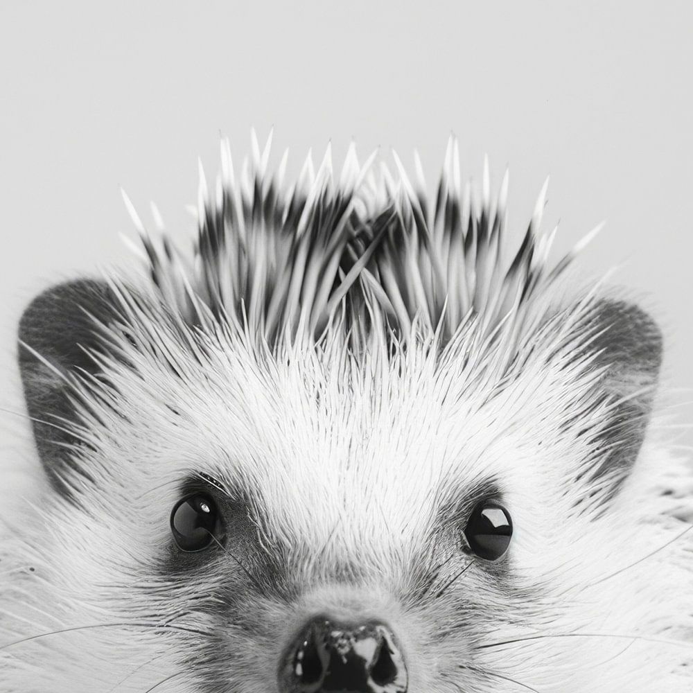 This enchanting black and white photo captures the curious gaze of a hedgehog in an intimate portrait. The clear contrasts and soft grey tones highlight the fine details and unique personality of the little animal. Perfect for animal lovers and photography art enthusiasts, this image brings a warm yet elegant touch to any living or working environment. Ideal as an eye-catcher or addition to an existing art collection.