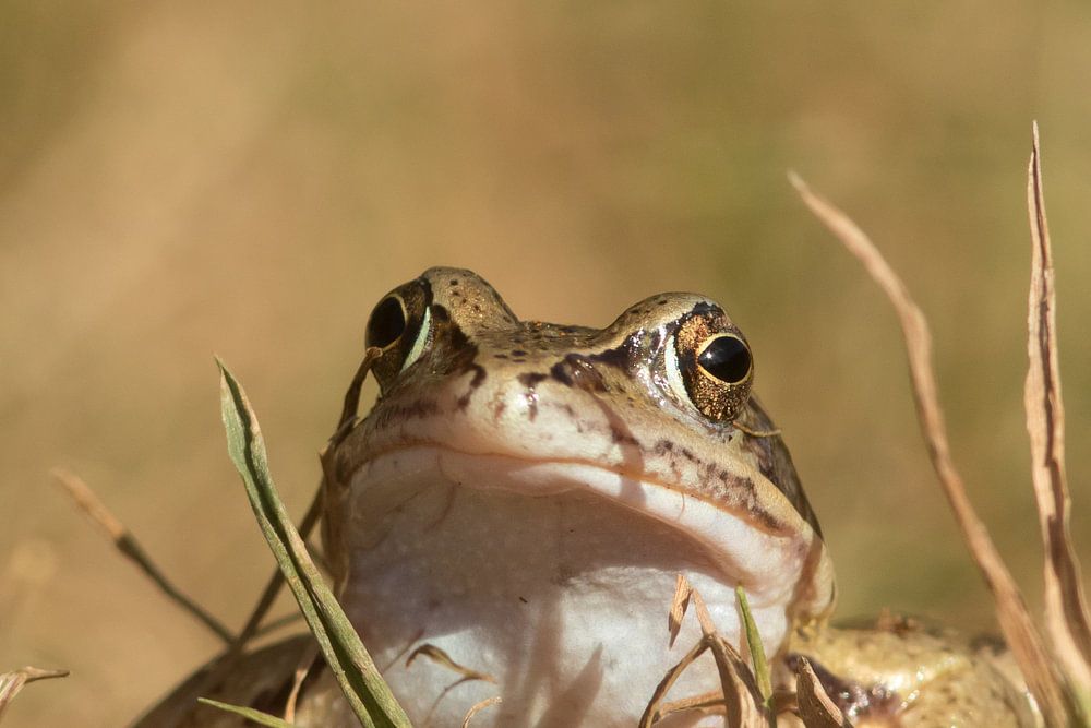 Hei kikker recht van voren en laag bij de grond gefotografeerd