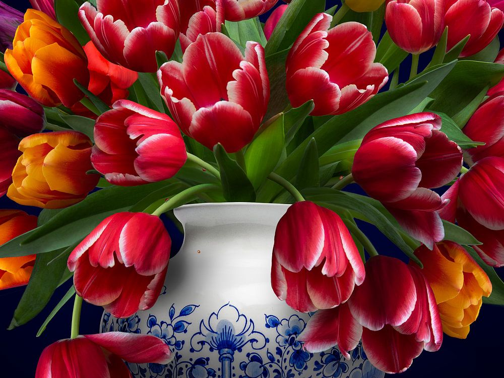Buy this still life Heinen Delft Blue Vase and Tulips Still Life by Fine Art Flower - Artist Sander van Laar on canvas, ArtFrame, poster and wallpaper, printed on demand in high quality