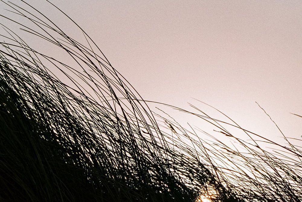 Analogue photograph of a view of the dunes with backlight on a sunny winter day at the Belgian coast.