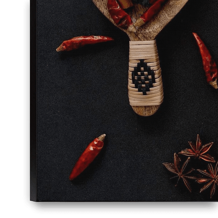 Various colourful spices and herbs. The look is rustic partly due to the dark stone base. A picture that looks perfect in your kitchen or behind a kitchen island. A cheerful palette of colours and flavours that will make every meal a party. At Werk aan de Muur, you can also choose a canvas with a wooden frame. You can choose from white,…