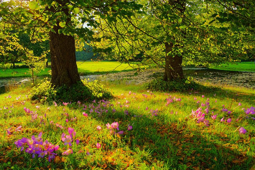 Herfsttijloos en lindebomen op Landgoed Elswout. Roze bloemen en bomen in het gras in het najaar.