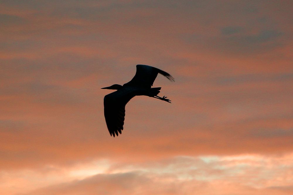 Heron at sunset. Silhouette of a heron in the pink gray sky. Branches with leaves in the background.