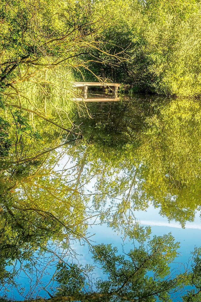 zeer natuurlijke omgeving waarin het bewust kleine bruggetje een rol speelt, en waarin de weerspiegeling een extra dimensie toevoegt