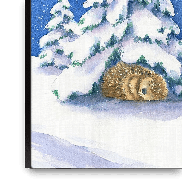Sleeping hedgehog in winter is a hand-painted watercolour painting in portrait format by the artist Karen Kaspar.