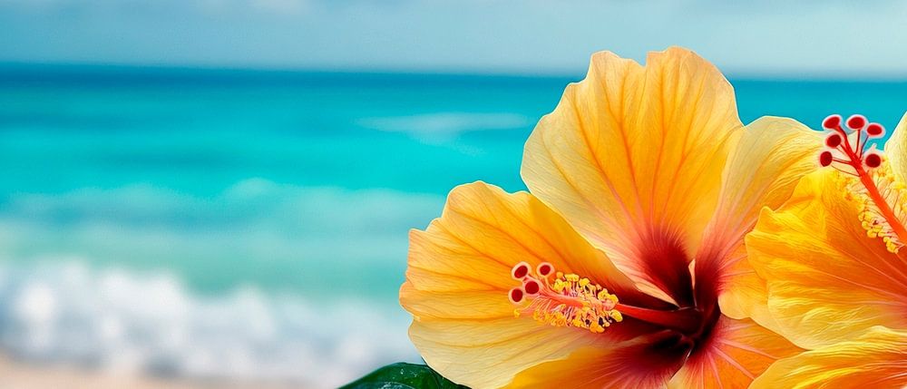 Tropical sunbeams embrace lushly blooming hibiscus flowers in bright yellow, while gentle waves lapping softly in the background. This vibrant image conveys a sense of holiday and relaxation, perfect for the living room or bedroom. It brings a summer mood and a relaxed atmosphere to any room.