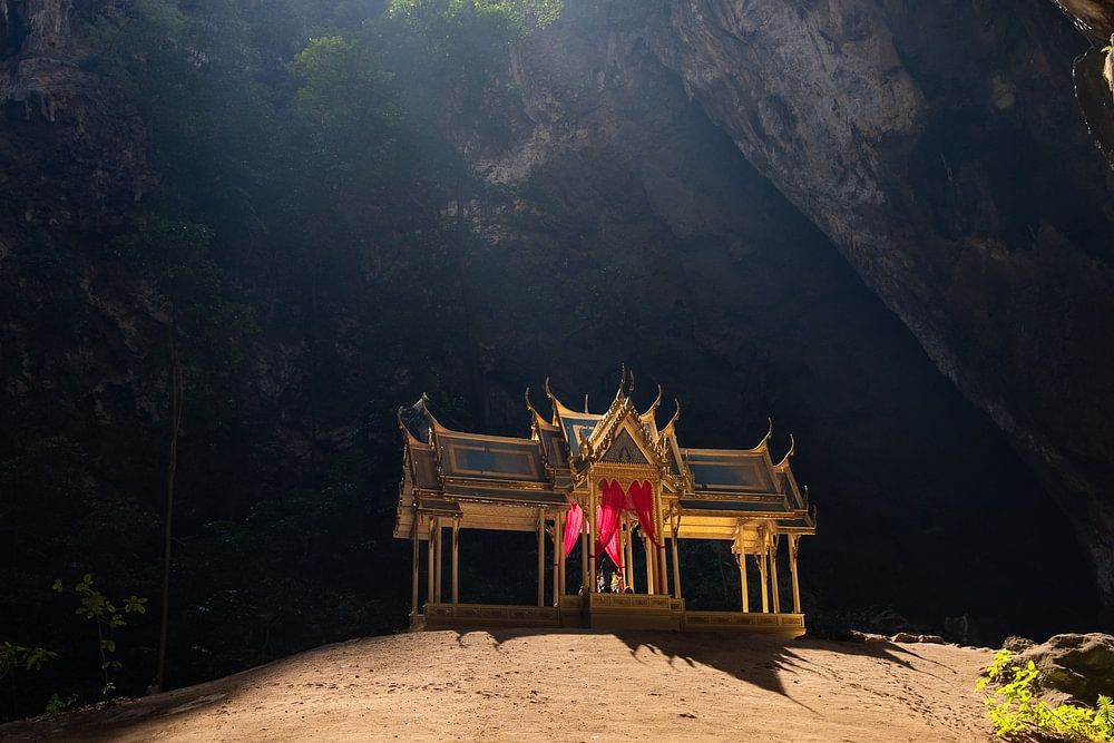 Hidden in the impressive Phraya Nakhon cave, the iconic temple exudes an almost magical beauty. The soft sunlight falling through the opening illuminates the ancient pavilion, creating an enchanting contrast between nature and architecture. A breathtaking picture of a hidden gem in Thailand.