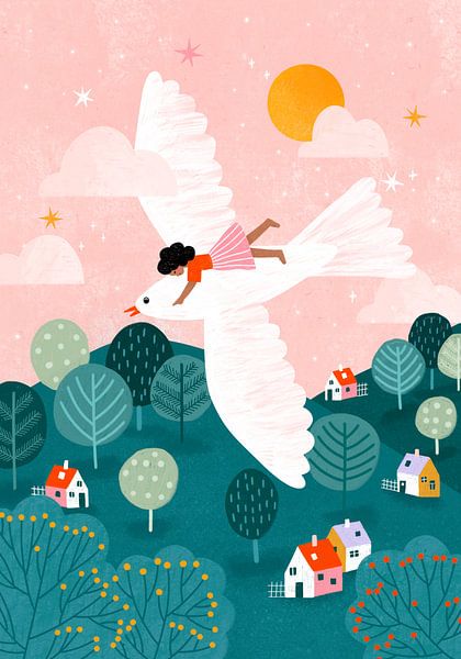 This illustration depicts a girl clinging to a large white bird as they fly through the air together. The image has a soft and dreamy quality. The simple shapes and muted colours convey a sense of freedom and lightness, as if everything has paused for a moment.