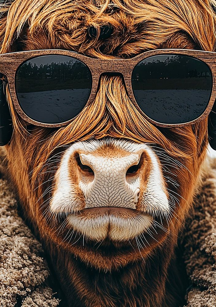 A highland cow with sunglasses and headphones, dressed in a woollen coat, looks directly into the camera in a humorous way, as if posing for a photo.
