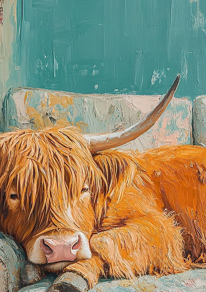 The idea of Highland cows on a sofa is a charming combination of rural elegance and modern comfort. This unexpected scene reminds us how important it is to find moments of calm and well-being even in a hectic world. The Highland Cow, known for its serenity and resilience, becomes a symbol of the art of relaxing and enjoying life. Its presence on a sofa evokes the idea that we can take inspiration from nature to unwind in our own home. This representation reminds us that beauty and tranquillity can be found even in the simplest moments of life.