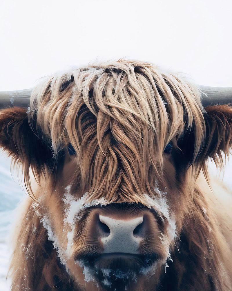 Buy this landscape artwork Highland cattle in the snow by fernlichtsicht on canvas, ArtFrame, poster and wallpaper, printed on demand in high quality.