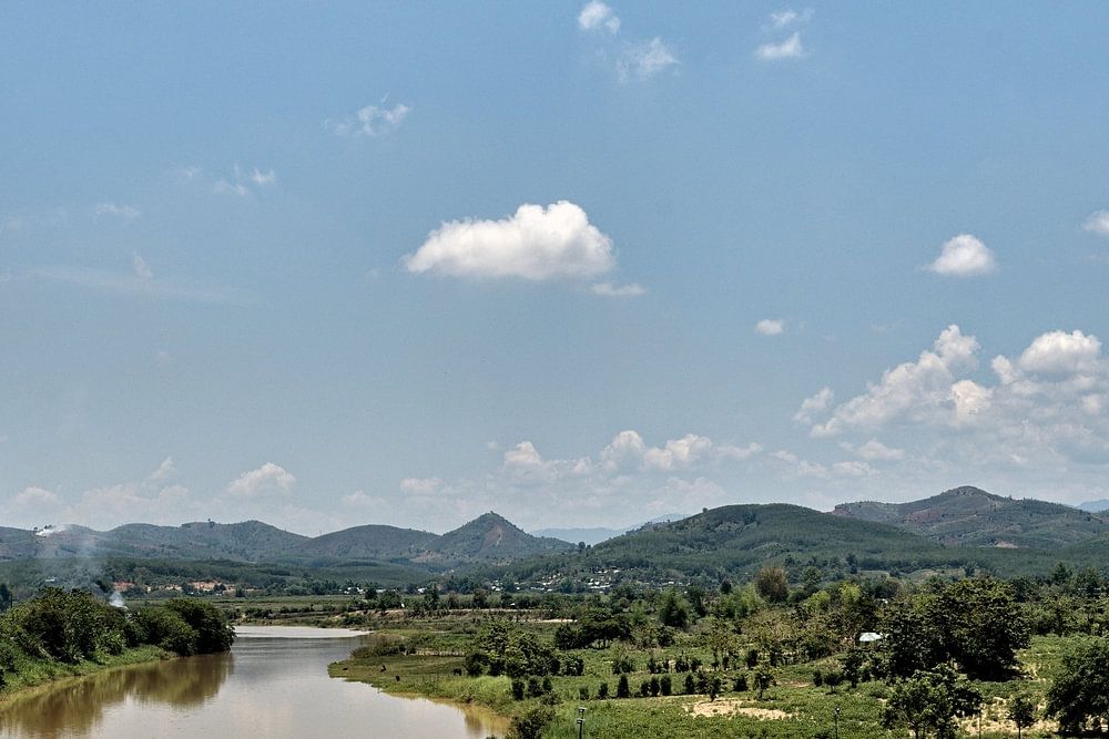 This photo captures the serenity of the Đăk Bla River, which meanders gently through Kon Tum province in central Vietnam. Surrounded by lush vegetation and bordered by rolling hills on the horizon, the river reveals a panorama typical of the Central Highlands. The contrast between the ochre-coloured water, the result of alluvial deposits, and the blue sky punctuated by cottony clouds offers a natural composition of great beauty.