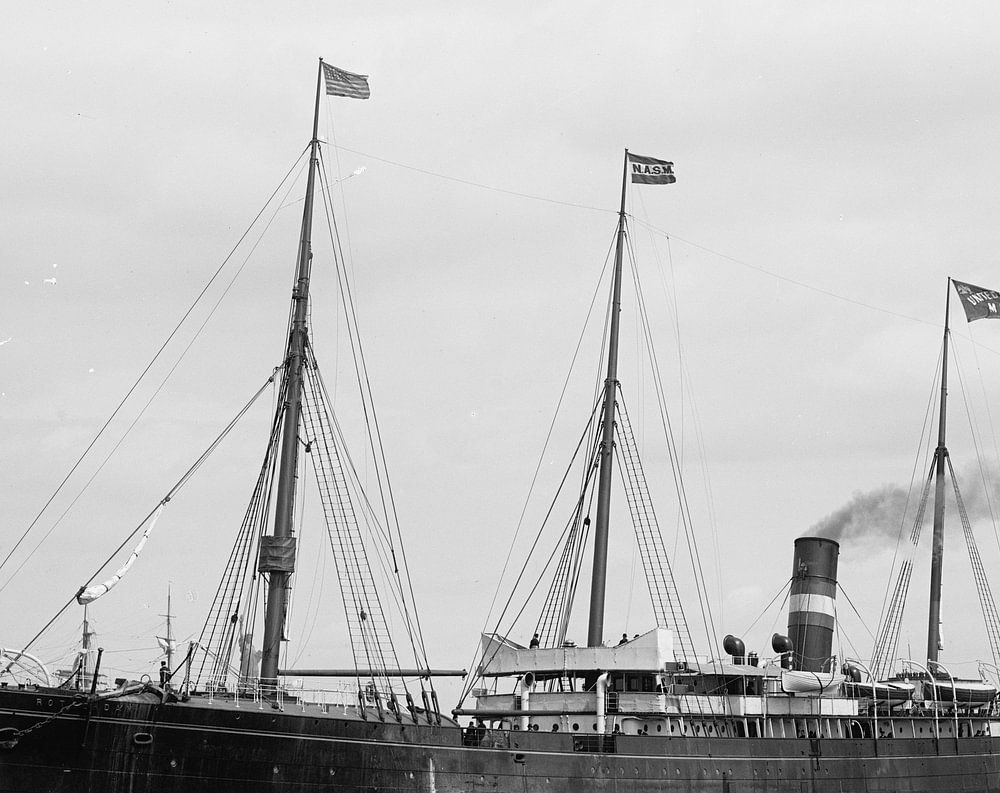 Photo probably taken 1897 and 1907. The 2nd plane on the ship belongs to N.A.S.M, the Nederlandsch Amerikaansche Stoomvaart Maatschappij. The 3rd flag belongs to the United States Postal Service (United States Mail).