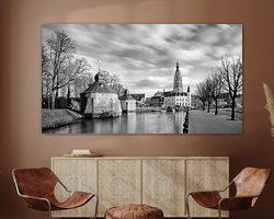 A classic image of Breda, where I have several historic buildings established in a unique setting. Left in the foreground Garnet Tower and Duiventoren current Royal Military Academy (KMA), part of the Castle of Breda. In the distance, the white building, which currently houses a restaurant is located. Formerly the post office in Breda. And of course in the distance the Great Church, also called the Church of Our Lady. Great wall this picture gives an image with lots of details and dynamics. By using a slightly slower shutter speed in the picture, there arises a sense of movement. Clouds and water give a beautiful effect in this embodiment.