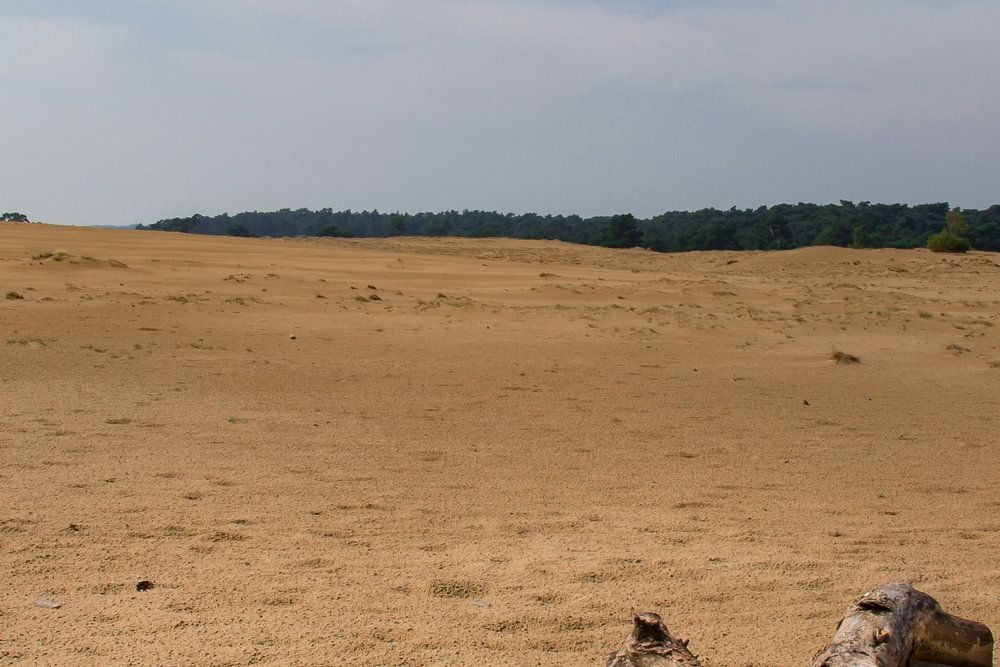 In een grote zandvlakte valt iedere oneffenheid op. Deze stam ligt eenzaam in de grote zandvlakte op de Hoge Veluwe. Is het een dood dier, is het een boomstam. ? Al wandelend door de hete zon onderzocht ik iedere oneffenheid in deze woestijnachtige omgeving.