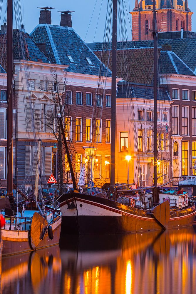 An evening at Hoge der A and Lage der A, the names of streets in the old city centre of Groningen on either side of the canal the A between Brugstraat and Visserstraat and a view of the A Church.