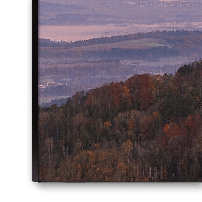 The iconic hilltop castle rises above the mist, surrounded by soft autumn colours and a peaceful morning atmosphere.