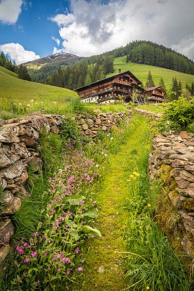 Buy the photo Hohlweg alley and mountain farms above Innervillgraten by Christian Müringer on canvas, ArtFrame, poster and wallpaper, printed on demand in high quality.