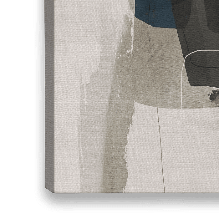Neutral shades of grey, beige and blue, geometric shapes and a rich background texture characterize this modern work by Roberto Moro. Fine, white and black lines loosen up the composition.