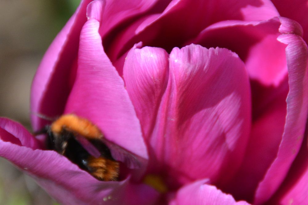 About "Hommel op zoek naar stuifmeel in roze tulp"