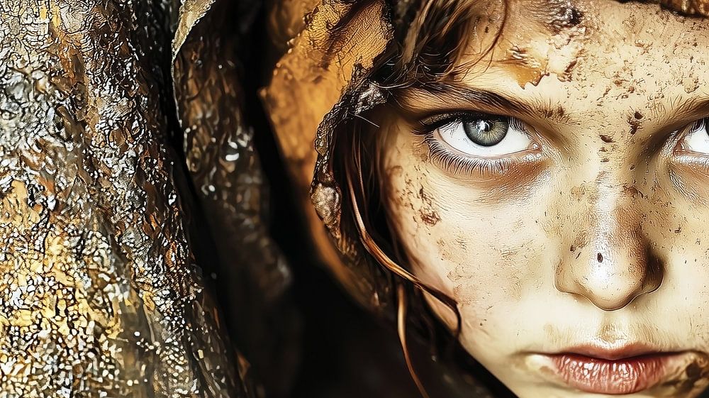 A young girl, covered in mud and traces of harsh living conditions, hides and looks desperately for help. Her face shows the suffering and strain that war and poverty place on innocent children, but there is a glimmer of hope in her eyes that indicates a will to survive and a longing for safety. This moving image captures the fragility and strength of the child in the midst of sorrow and hardship.