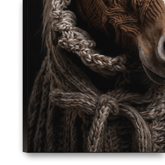 A fantasy picture of a beautiful horse with a knitted coat and a lovely thick winter jumper on. It is a photo-realistic image but, of course, one with a rich imagination. This also keeps the image captivating you.