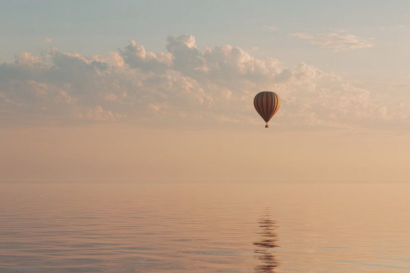 This artwork presents a calm and minimal scene: a single hot air balloon floating above a quiet sea in soft morning light. The horizon gently fades, allowing sky and water to blend into one tranquil composition. The balloon’s reflection adds balance and a sense of stillness.