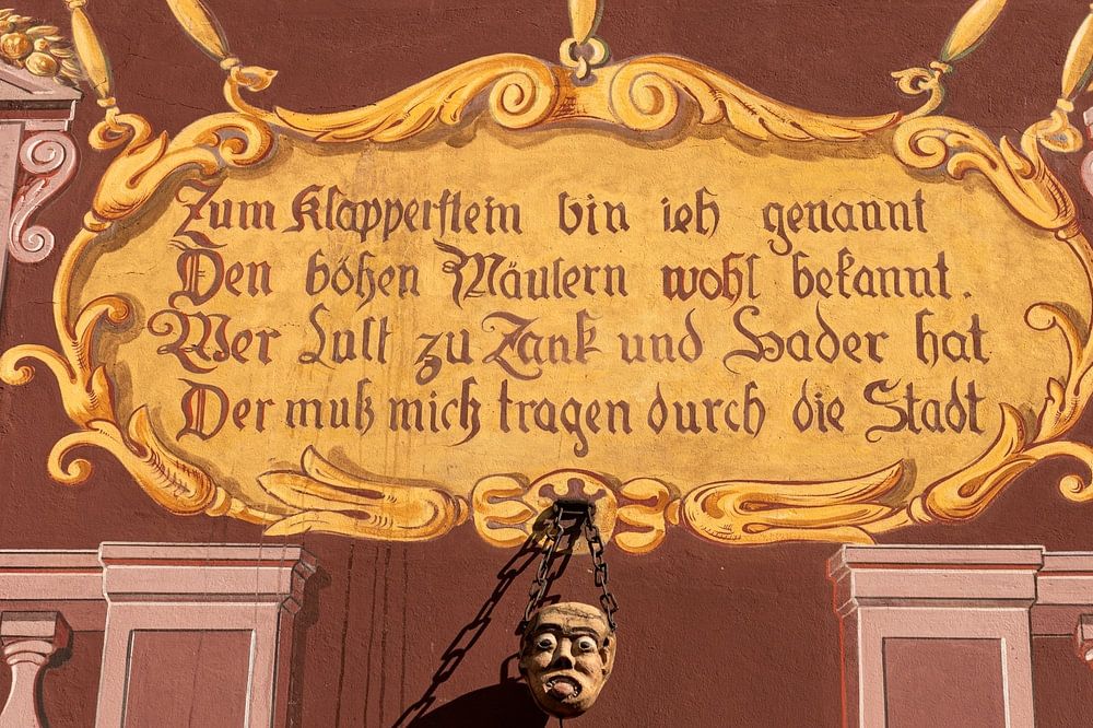 Mulhouse France Hôtel de Ville de Mulhouse. Frescoes with the so-called Klapperstein and a poem. The klapperstein was a large stone in this case the shape of a head with tongue sticking out which gossipmongers and slanderers would have to wear around the town on a donkey as a punishment for their gossiping. The German poem outlines the punishment.rathaus,crime, vilified, ancient