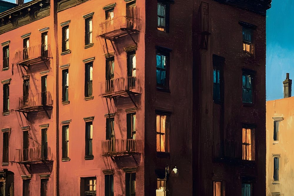 An urban street lined with multi-storey residential buildings in muted, contrasting colours. The façades are bathed in harsh light, with windows glowing sporadically from within. The street is empty, with no people in sight. A water tower rises above the rooftops, clearly anchoring the scene in mid-20th century American urban…