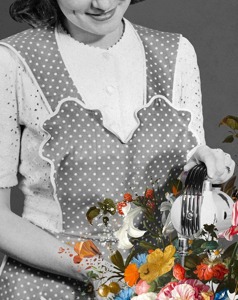 A woman, dressed in apron and a mixer in her hand, makes batter for a delicious cake full of flowers.