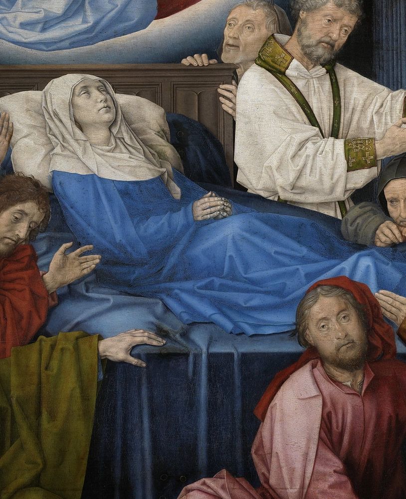 Mary, mother of Jesus Christ lies on her deathbed while her son looks on from heaven.