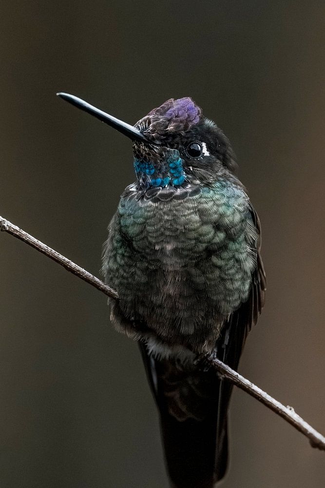 In this elegant close-up, a hummingbird sits silently on a fragile branch, its iridescent feathers resplendent in shades of emerald green, purple and deep blue. The dark background highlights the bird's subtle gradients and delicate silhouette, creating an almost meditative calm. This sophisticated portrait captures the magic of the small and fragile - an enchanting choice for a stylish and natural interior.