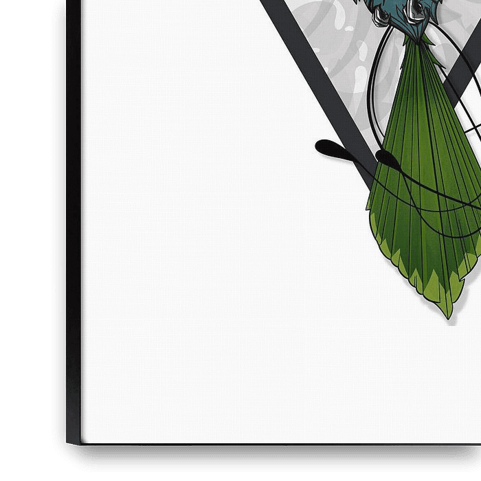This illustration is something special for your interior and shows a stylised hummingbird in flight. The colourful bird with its accents on the wings and artistic ornaments on the body embodies freedom and lightness. The style of the drawing is graphic and detailed, with a touch of fantasy.