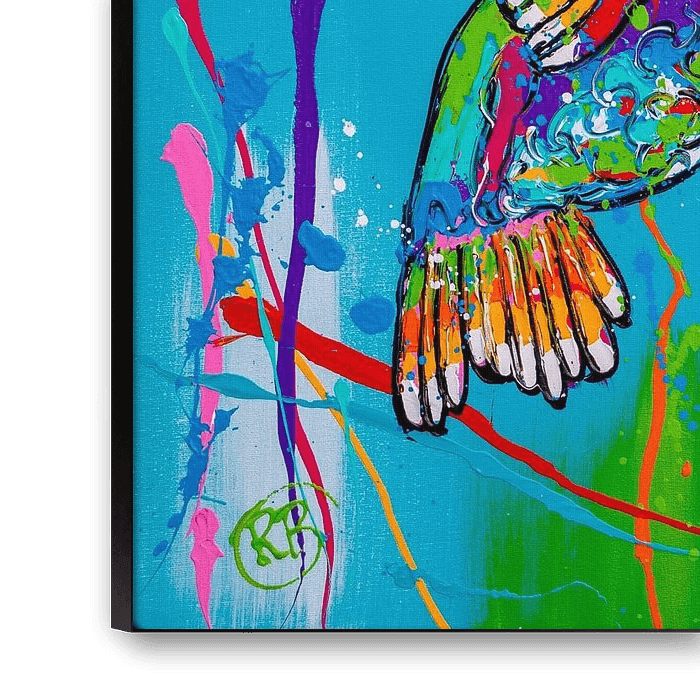 Colourful scene with two happy hummingbirds by artist Renate Rolefes. The size of the original painting is 80 x 60 and painted with acrylic paint.