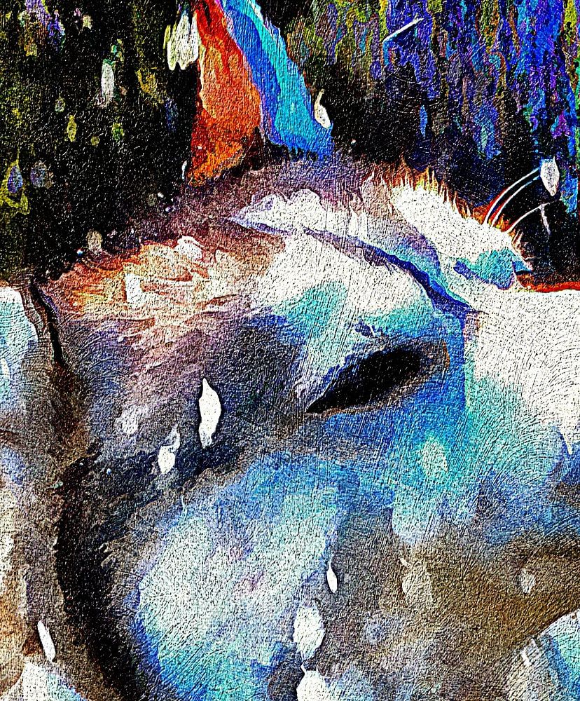 Sitting in the back garden of an urban home, the husky looks up with surprise at the snowflakes falling from the sky. He raised himself up and lifted his face to greet the snow, as if aware of his heritage. A portrait of a husky. Photo art.