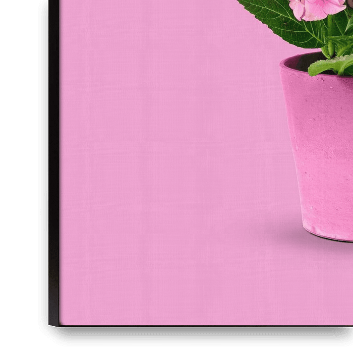This art photo shows a potted pink hydrangea plant, with three full flowers in a matching pink pot, isolated against a monochrome pink background. Subtle Photoshop editing gives the colours extra depth and intensity, without losing their softness.